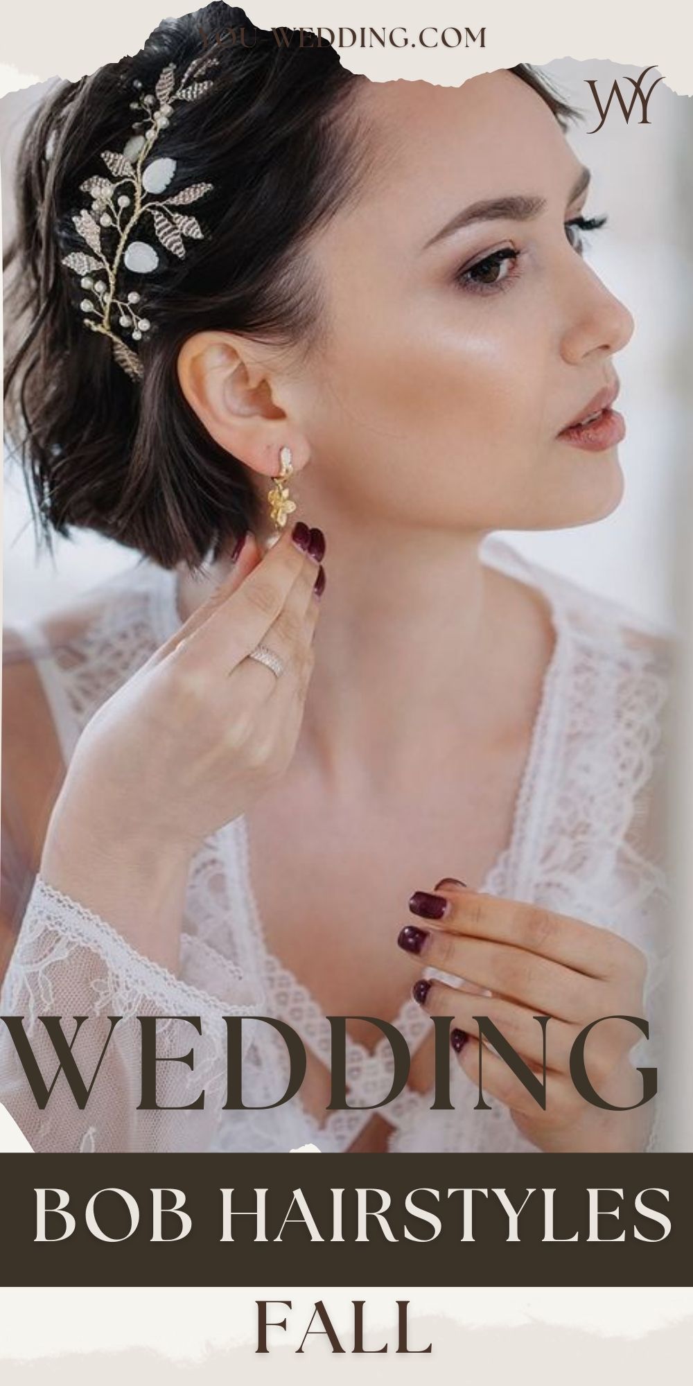 A beautifully crafted wreath adorned with pearls and lace, this headpiece is the epitome of bridal elegance. The bride’s blonde hair is styled in soft waves, with the wreath adding a touch of sophistication and grace. This autumn wedding hair wreath is perfect for brides looking for a timeless and classic accessory that complements their bridal look seamlessly.